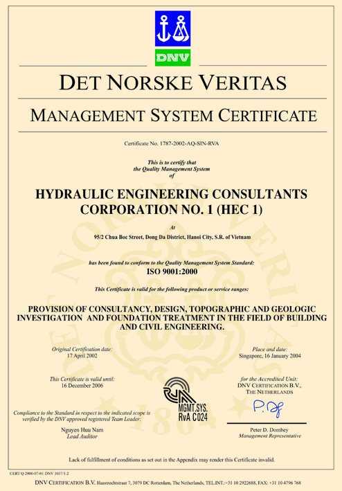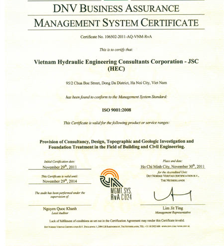 HEC was granted the Certificate ISO 9001:2000 on 16/01/2004 by DET NORSKE VERITAS (DNV) of the Netherlands and on 30/11/2011, it was upgraded to Certificate ISO 9001:2008.