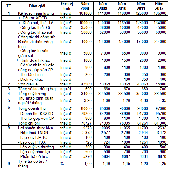 Chi tiết phương án sản xuất kinh doanh cho 05 năm giai đoạn (2008-2012) được xem tại đây.