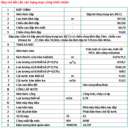 Dưới đây tóm tắt một số thông số chính của dự án: