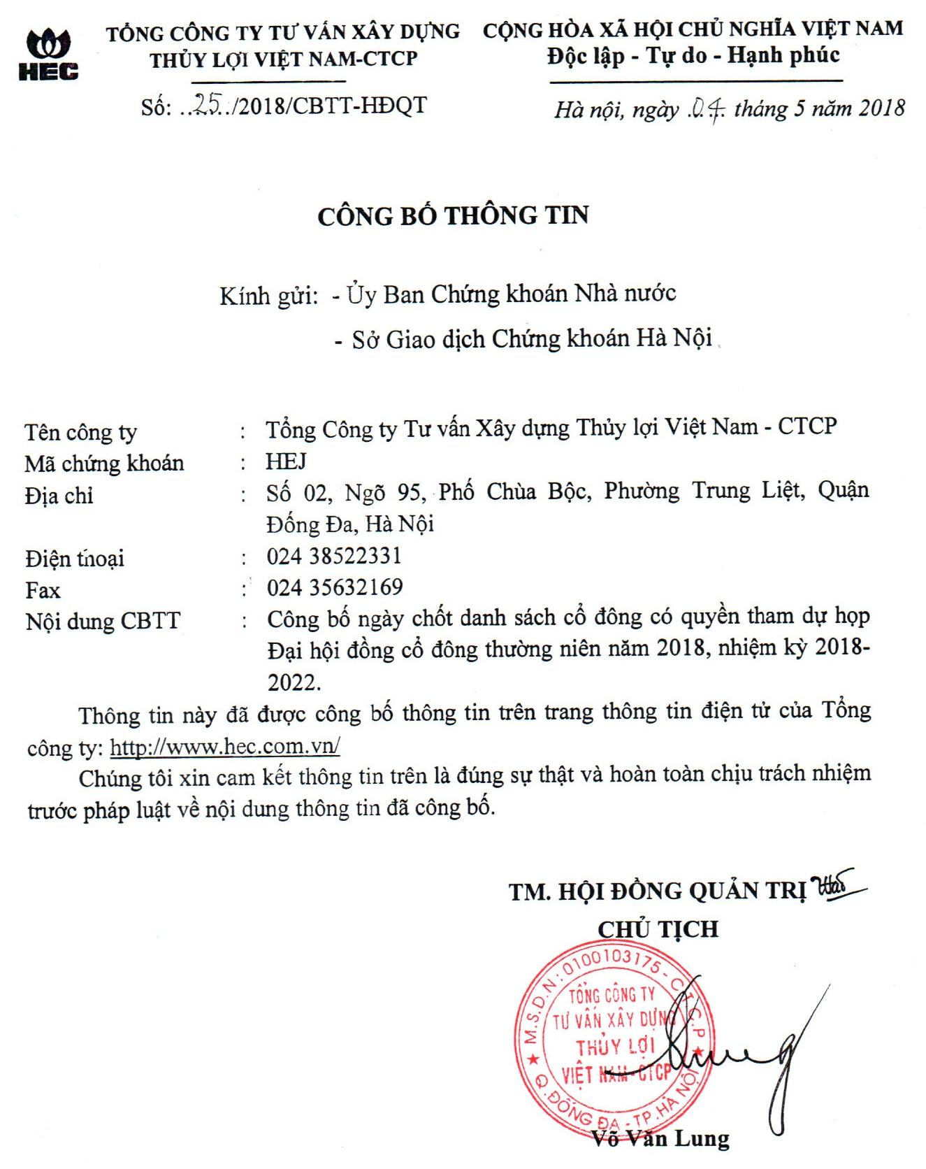 Gia hạn thời gian tổ chức Đại hội đồng cổ đông thường niên 2018 của Tổng công ty Tư vấn Xây dựng Thủy lợi Việt Nam-CTCP(16/04/2018)