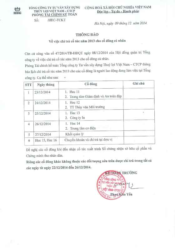Phòng Tài chính Kế toán Tổng Công ty Tư vấn Xây dựng Thủy lợi Việt Nam - CTCP thông báo lịch chi trả cổ tức năm 2013 cho các cổ đông là người lao động đang làm việc tại Tổng công ty. Cụ thể như sau: