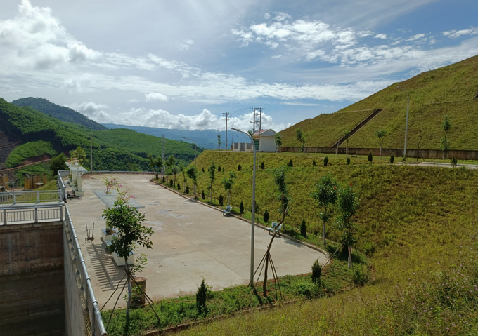 Vai phải đập chính hồ Đồng Mít được ứng dụng công nghệ neoweb để trồng cỏ làm tăng thêm nét mỹ thuật cho công trình. Ảnh: M.P.